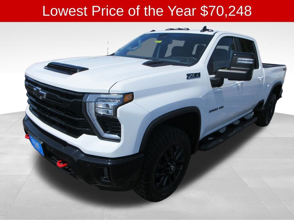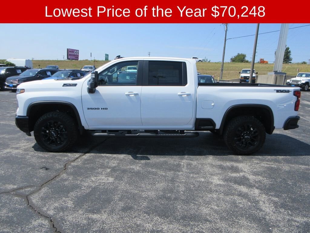 Summit White 2025 Chevrolet Silverado 3500HD LT 4WD 10-Speed Automatic Duramax 6.6L V8 Turbodiesel Silverado 3500HD LT, 4D Crew Cab, Duramax 6.6L V8 Turbodiesel, 10-Speed Automatic, 4WD, Summit White, Jet Black Cloth, 10-Way Power Driver Seat Adjuster w/Lumbar, 120-Volt Bed Mounted Power Outlet, All Star Edition, Animated LED Projector Headlamps, Auto-Dimming Inside Rear-View Mirror, Bed View Camera w/2 Trailer Camera Provisions, Black Grille Bar w/Chevy Black Bow Tie, Chevytec Spray-On Black Bedliner, Cloth Rear Seat w/Storage Package, Convenience Package, Convenience Package II, Dual-Zone Automatic Climate Control, Front Frame-Mounted Red Recovery Hooks, Front LED Fog Lamps, HD Surround Vision, Heat Package, Heated Driver & Front Outboard Passenger Seats, Heated Steering Wheel, High Gloss Black Front Bumper, High Gloss Black Mirror Caps, High Gloss Black Rear Bumper, Hitch Guidance w/Hitch View, In-Vehicle Trailering App System, Leather Package, LED Cargo Area Lighting, Manual Tilt-Wheel/Telescoping Steering Column, Perimeter Lighting, Power Sliding Rear Window w/Defogger, Power-Adjustable Outside Mirrors, Rear Cross Traffic Alert, Safety Package, Trail Boss Package, Trailer Camera Provisions, Trailer Side Blind Zone Alert, Ultrasonic Front & Rear Park Assist, Universal Home Remote, Up-Level Rear Seat w/Storage Package, Wheels: 20 High-Gloss Black Painted.