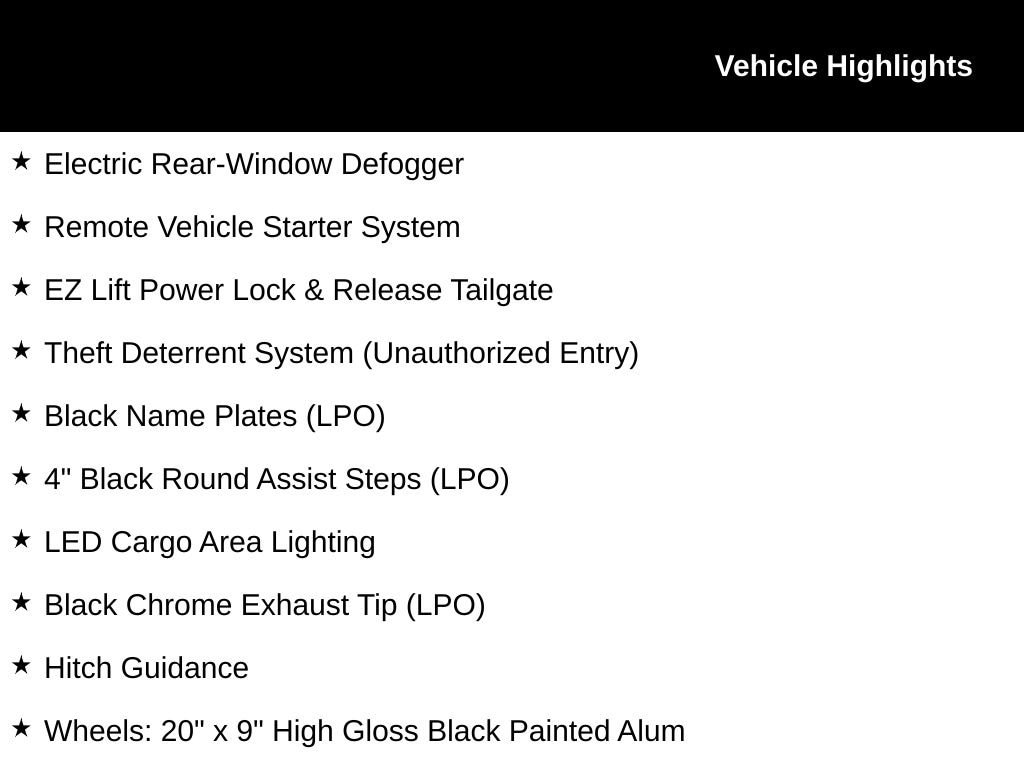 • Black tailgate decal lettering (replaced with Black bowtie when Multi-Flex tailgate is ordered)
