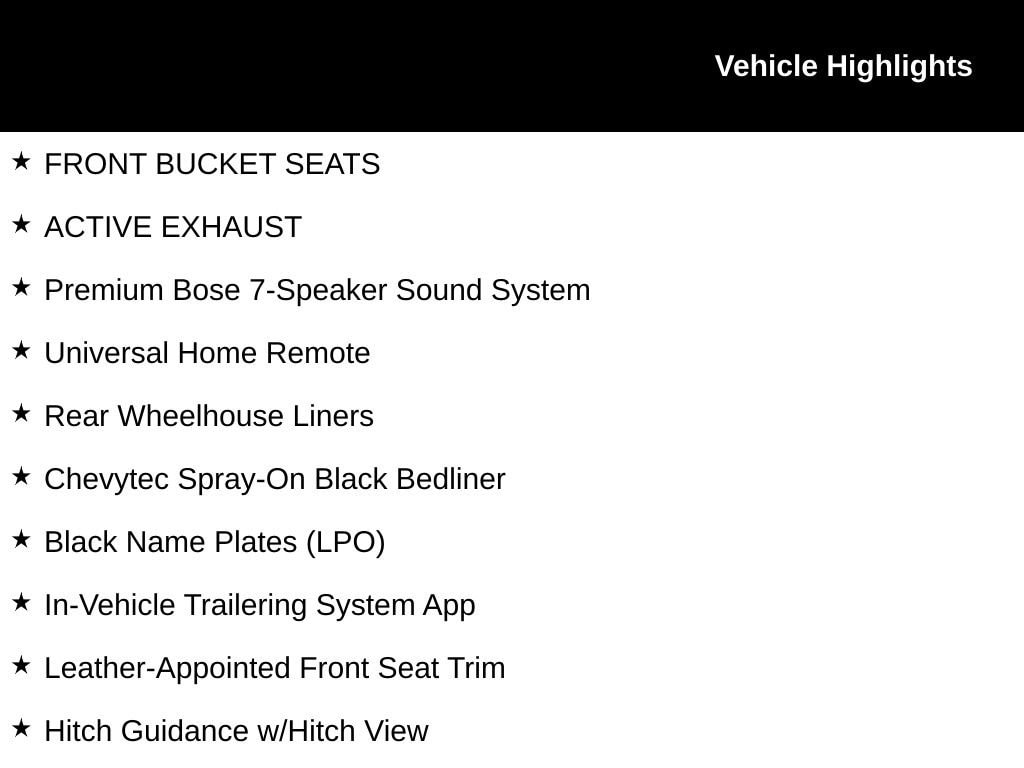 • Black tailgate decal lettering (replaced with Black bowtie when Multi-Flex tailgate is ordered)