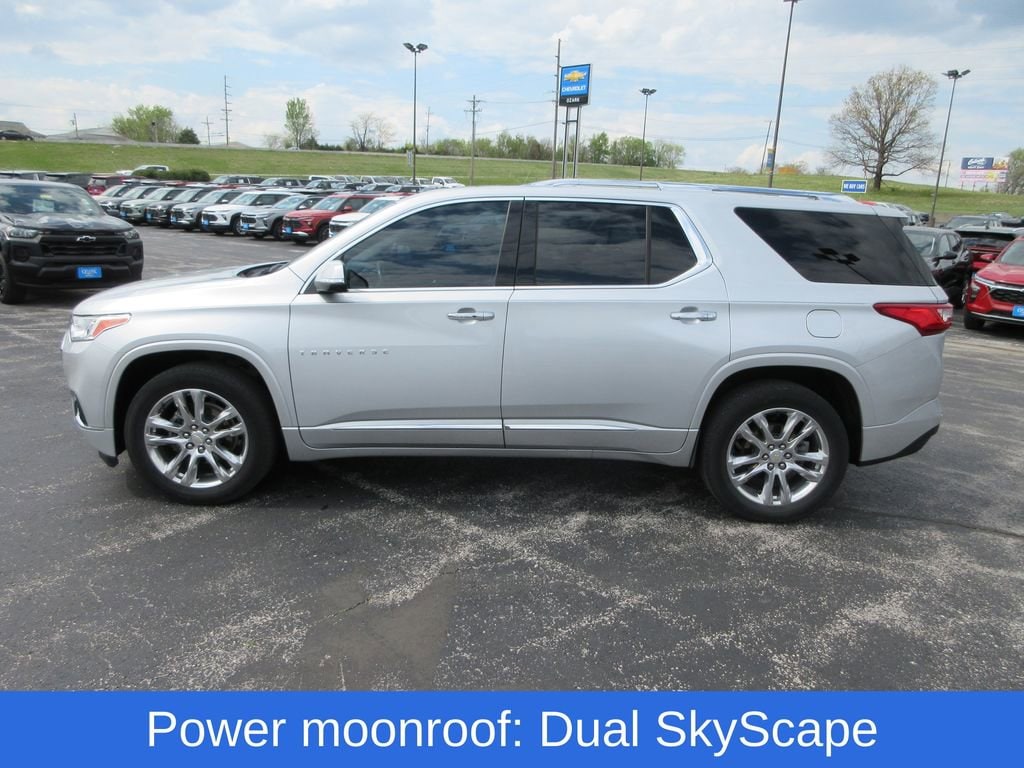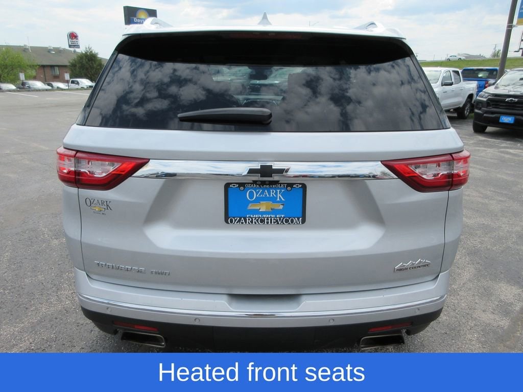 Traverse High Country, 4D Sport Utility, 3.6L V6 SIDI VVT, 9-Speed Automatic, AWD, Silver Ice Metallic, Jet Black Leather, Apple CarPlay/Android Auto, Heated front seats, Navigation System, Perforated Leather-Appointed Seat Trim, Power Liftgate, Power moonroof: Dual SkyScape, Preferred Equipment Group 2LZ, Steering wheel memory. Preferred Equipment Group 2LZ, Cargo Package (LPO) (Retractable Cargo Shade and Vertical Cargo Net (LPO)), Floor Liner Package (LPO) (1st & 2nd Row All-Weather Floor Liner (LPO), 3rd Row All-Weather Floor Liner (LPO), and Integrated Cargo Liner (LPO)), Roadside Safety Package (LPO) (First Aid Kit (LPO) and Highway Safety Kit), Traverse High Country, 4D Sport Utility, 3.6L V6 SIDI VVT, 9-Speed Automatic, AWD, Silver Ice Metallic, Jet Black Leather, Apple CarPlay/Android Auto, Heated front seats, Navigation System, Perforated Leather-Appointed Seat Trim, Power Liftgate, Power moonroof: Dual SkyScape, Steering wheel memory, 10 Speakers, 20 Polished Aluminum Wheels, 3.49 Axle Ratio, 3rd row seats: split-bench, 4-Wheel Disc Brakes, 7-Passenger Seating (2-2-3 Seating Configuration), ABS brakes, Air Conditioning, Alloy wheels, AM/FM radio: SiriusXM with 360L, Auto High-beam Headlights, Auto-dimming door mirrors, Auto-dimming Rear-View mirror, Automatic temperature control, Bose Premium 10-Speaker Audio System Feature, Brake assist, Bumpers: body-color, Compass, Delay-off headlights, Driver door bin, Driver vanity mirror, Dual front impact airbags, Dual front side impact airbags, Electronic Stability Control, Emergency communication system: OnStar and Chevrolet connected services capable, Four wheel independent suspension, Front & Rear Black Bowtie Emblems (LPO), Front anti-roll bar, Front Bucket Seats, Front Center Armrest, Front dual zone A/C, Front fog lights, Front reading lights, Fully automatic headlights, Garage door transmitter, Heated door mirrors, Heated rear seats, Heated steering wheel, Illuminated entry, Leather steering wheel, Low tire pressure warning, Memory seat, Occupant sensing airbag, Outside temperature display, Overhead airbag, Overhead console, Panic alarm, Passenger door bin, Passenger vanity mirror, Power door mirrors, Power driver seat, Power passenger seat, Power steering, Power windows, Premium audio system: Chevrolet MyLink, Radio data system, Radio: Chevrolet Infotainment 3 Premium System, Rear air conditioning, Rear anti-roll bar, Rear reading lights, Rear Seat Info System w/DVD Player (LPO) (DISC), Rear window defroster, Rear window wiper, Remote keyless entry, Roof rack: rails only, Security system, SiriusXM w/360L, Speed control, Speed-sensing steering, Spoiler, Steering wheel mounted audio controls, Tachometer, Telescoping steering wheel, Tilt steering wheel, Traction control, Trip computer, Turn signal indicator mirrors, Variably intermittent wipers, Ventilated front seats, and Voltmeter. 2021 Chevrolet Traverse High Country AWD 9-Speed Automatic 3.6L V6 SIDI VVT Recent Arrival!