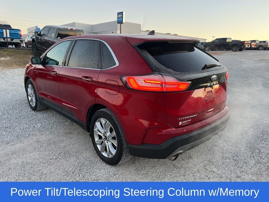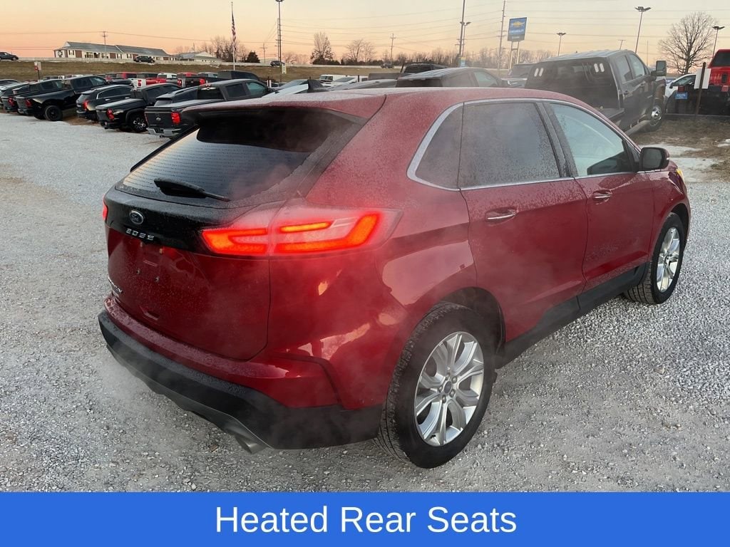 Edge Titanium, 4D Sport Utility, EcoBoost 2.0L I4 GTDi DOHC Turbocharged VCT, 8-Speed Automatic, FWD, Red, Ceramic Leather, Adaptive Cruise Control w/Stop & Go, Auto-Dimming Driver's Sideview Mirror, Connected Built-In Navigation, Enhanced Active Park Assist, Equipment Group 301A, Evasive Steering Assist, Front 180-Degree Camera w/Split View, Heated front seats, Heated Rear Seats, Lane Centering, Leather-Trimmed Heated/Cooled Sport Bucket Seats, Power Tilt/Telescoping Steering Column w/Memory. Equipment Group 301A (Adaptive Cruise Control w/Stop & Go, Auto-Dimming Driver's Sideview Mirror, Connected Built-In Navigation, Enhanced Active Park Assist, Evasive Steering Assist, Front 180-Degree Camera w/Split View, Heated Rear Seats, Lane Centering, Leather-Trimmed Heated/Cooled Sport Bucket Seats, Power Tilt/Telescoping Steering Column w/Memory, and Adaptive LED Headlamps), Edge Titanium, 4D Sport Utility, EcoBoost 2.0L I4 GTDi DOHC Turbocharged VCT, 8-Speed Automatic, FWD, Red, Ceramic Leather, Heated front seats, 12 Speakers, 3.80 Axle Ratio, 4-Wheel Disc Brakes, ABS brakes, Air Conditioning, Alloy wheels, AM/FM radio: SiriusXM with 360L, Auto High-beam Headlights, Auto-dimming Rear-View mirror, Automatic temperature control, Brake assist, Bumpers: body-color, Compass, Delay-off headlights, Driver door bin, Driver vanity mirror, Dual front impact airbags, Dual front side impact airbags, Electronic Stability Control, Emergency communication system: SYNC 4 911 Assist, FordPass Connect, Four wheel independent suspension, Front anti-roll bar, Front Bucket Seats, Front Center Armrest w/Storage, Front dual zone A/C, Front fog lights, Front reading lights, Fully automatic headlights, Garage door transmitter, Heated door mirrors, Heated steering wheel, Illuminated entry, Knee airbag, Leather-Trimmed Heated Sport Bucket Seats, Low tire pressure warning, Memory seat, Occupant sensing airbag, Outside temperature display, Overhead airbag, Overhead console, Panic alarm, Passenger door bin, Passenger vanity mirror, Power door mirrors, Power driver seat, Power Liftgate, Power passenger seat, Power steering, Power windows, Radio: B&O Sound System by Bang & Olufsen, Rain sensing wipers, Rear anti-roll bar, Rear reading lights, Rear seat center armrest, Rear window defroster, Rear window wiper, Remote keyless entry, Security system, SiriusXM w/360L, Speed control, Speed-Sensitive Wipers, Split folding rear seat, Spoiler, Steering wheel mounted audio controls, SYNC 4A w/Enhanced Voice Recognition, Tachometer, Telescoping steering wheel, Tilt steering wheel, Traction control, Trip computer, Turn signal indicator mirrors, Variably intermittent wipers, and Wheels: 19 Luster Nickel-Painted Aluminum. 2021 Ford Edge Titanium FWD 8-Speed Automatic EcoBoost 2.0L I4 GTDi DOHC Turbocharged VCT Recent Arrival! 21/29 City/Highway MPG